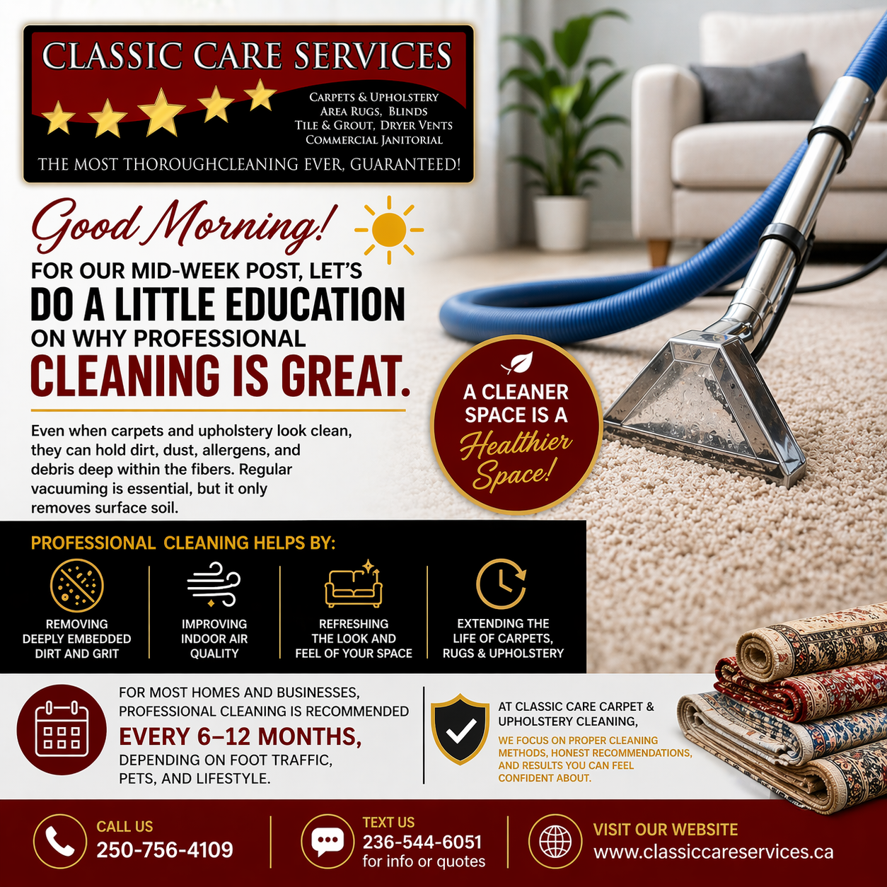 At Classic Care Carpet & Upholstery Cleaning, we focus on proper cleaning methods, honest recommendations, and results you can feel confident about.