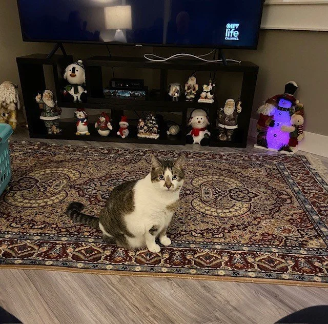 Here he is sitting on an absolutely beautiful area rug He’s Mick’s kitty cat and a very important member of the family. Mu’s specialty? Waking up his mom and dad in the middle of the night to play (he definitely keeps them on their toes!)